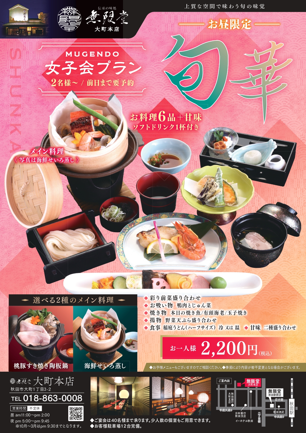 大町店「旬華」リニューアル!!お料理6品+デザート、メイン料理を2種類から選んで頂けます(1グループで1種類、全員同じメイン料理になります)。さらにソフトドリンク1杯が付いて税込み2,200円)前日までの要予約で2名様よりご予約可能)