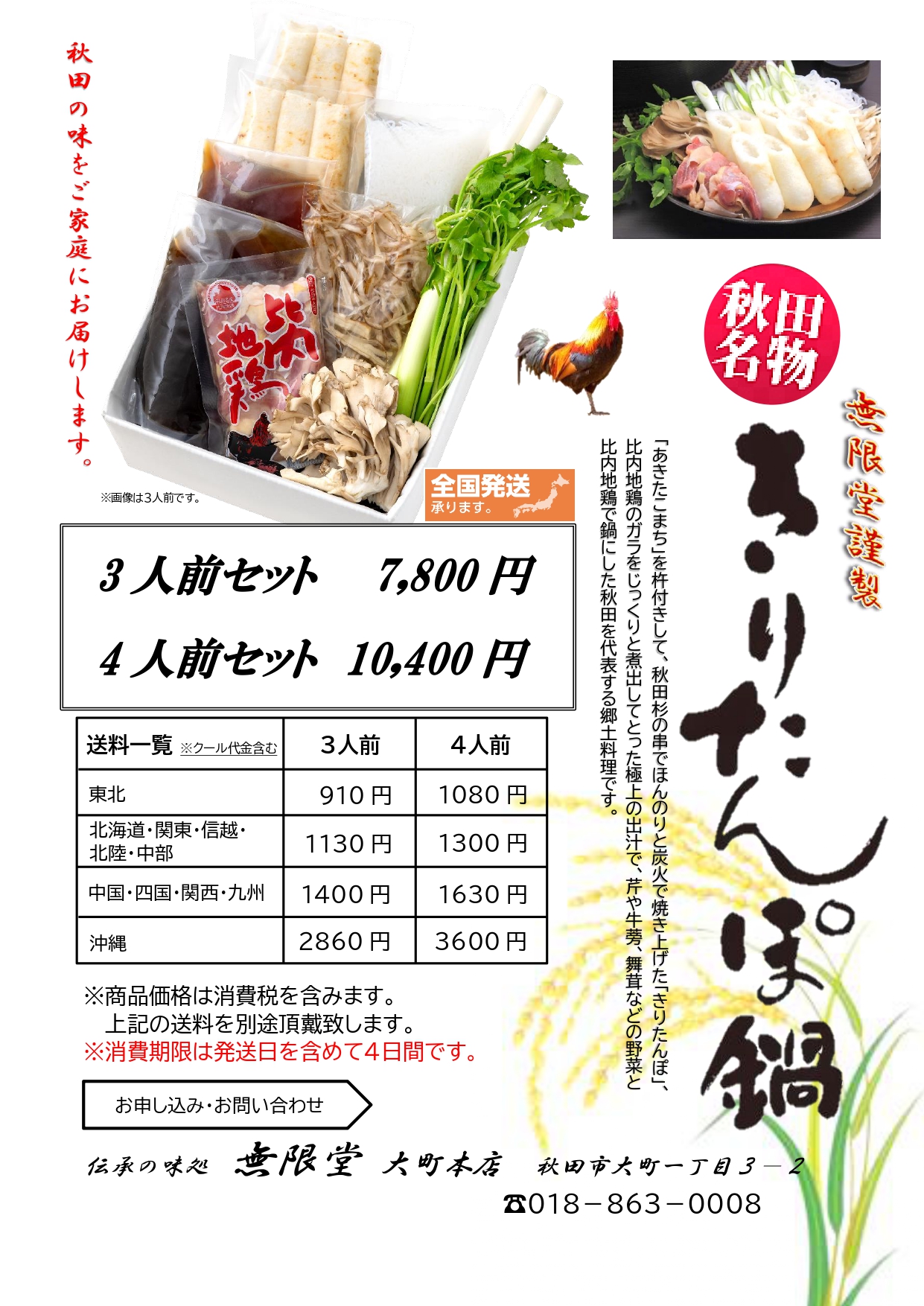 無限堂謹製「きりたんぽ」の配送受付中。秋田の郷土料理をご自宅または贈り物としていかがですか?