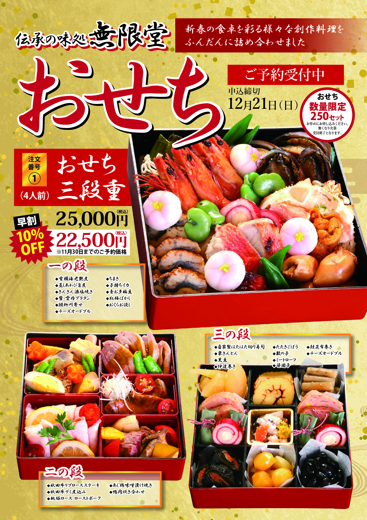 無限堂謹製おせちのご予約が始まりました!新春の食卓を彩る様々な創作料理をふんだんに詰め合わせました!申込締め切りは12月21日(日)まで。11月30日までのお得な早割で通常価格25000円(税込)が10%OFFの22500円(税込)となります。ご予約はお早目にどうぞ!数量限定250セット。無くなり次第受付終了となります。
