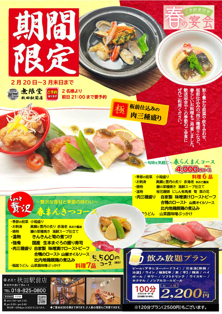 2月20日より歓送迎会シーズンに向けて春の宴会コース「春らんまんコース」料理6品4000円税込みと「春まんきつコース」料理7品5500円税込みをスタート致します。板前仕込みの肉料理や季節の食材を使った春らしい献立です。また+2200円で飲み放題(100分 20分前ラストオーダー)もお付けいただけます。詳しくはお店にお問い合わせくださいませ。