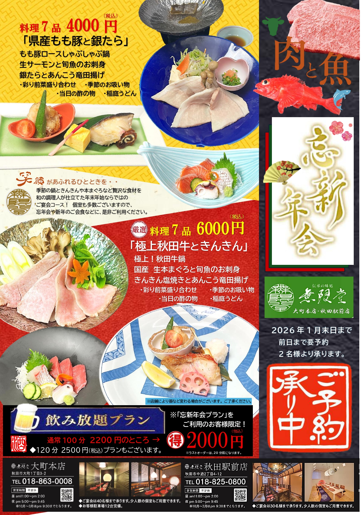 今年も始まります、無限堂特製「忘新年会プラン」4000円と6000円(税込み)どちらも7品でご提供させて頂きます。今年も肉と魚をコンセプトに「もも豚と銀たらのしゃぶしゃぶ鍋」や「秋田牛鍋」「きんきん塩焼き」など贅沢食材を楽しめます。またご予約特典として通常2200円飲み放題(100分)が忘新年会プランご予約のお客様のみ2000円(税込み)でご提供!!是非お試し下さいませ。※前日までの要予約です。