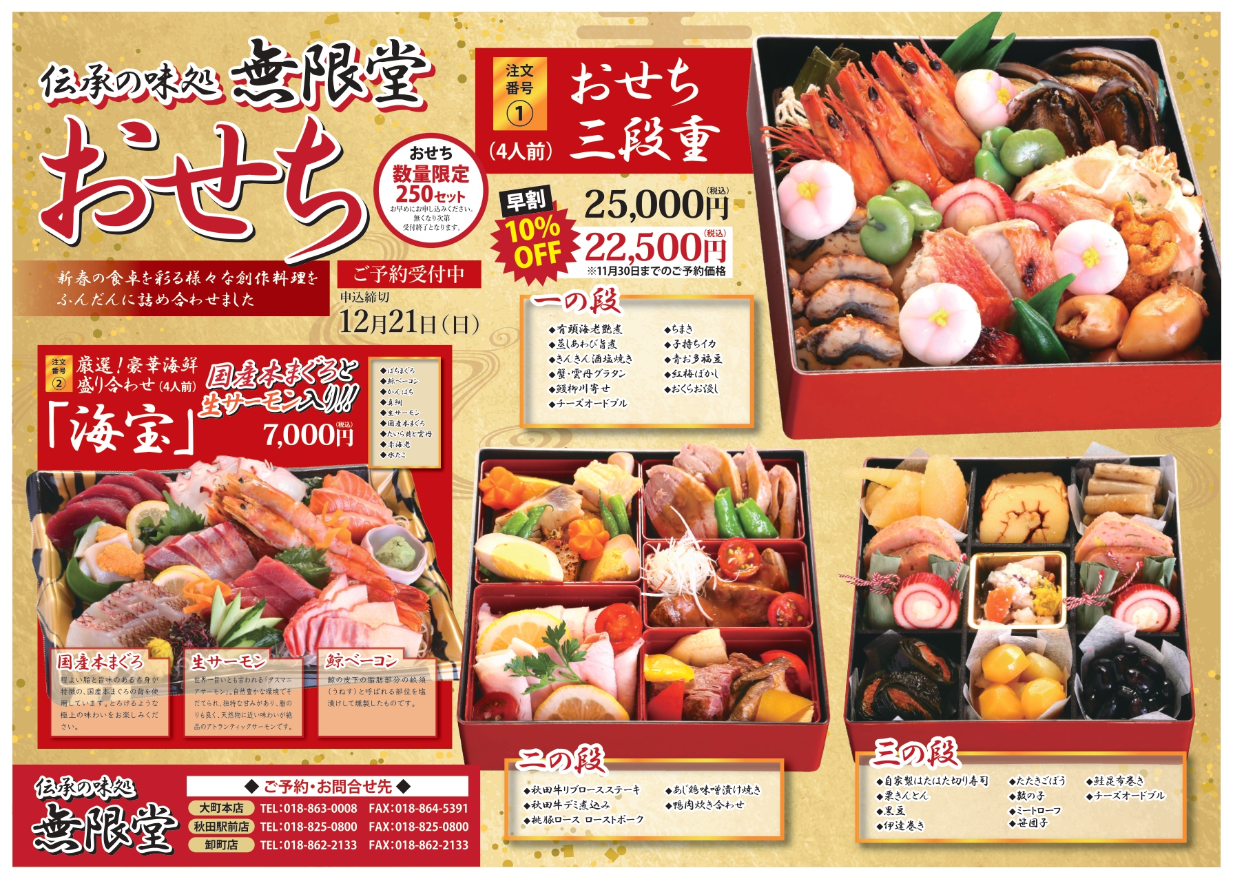 無限堂謹製おせちのご予約が始まりました!新春の食卓を彩る様々な創作料理をふんだんに詰め合わせました!申込締め切りは12月21日(日)まで。11月30日までのお得な早割で通常価格25000円(税込)が10%OFFの22500円(税込)となります。ご予約はお早目にどうぞ!数量限定250セット。無くなり次第受付終了となります。
